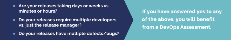 These assessments have been conducted for Fortune 500 and smaller companies, government agencies, and nonprofits. Putting the right DevOps practice in place can save you hundreds of thousands in your development costs. One client reported to us that they now save upwards of $30,000 per release due to less conflicts, delays, and defects.